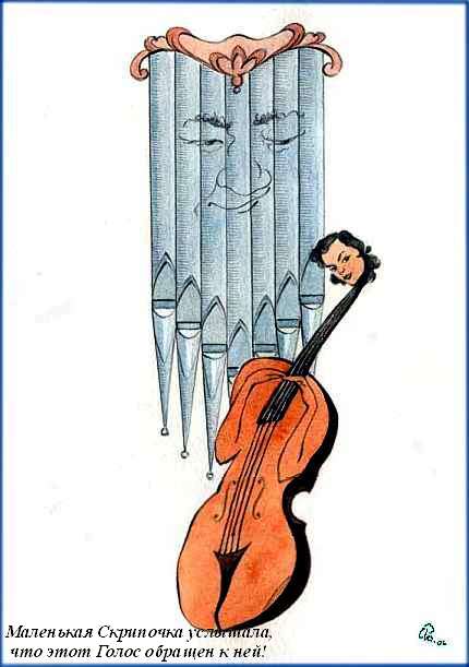 Однажды Оркестр выступал в Самой Большой Церкви Города. Там Маленькая Скрипочка впервые увидела Орган. Этот убеленный сединами труб Инструмент умел все! От ласковых и трогательных насвистываний (наверное он их знал от своего пра-пра-прадедушки - Бога лесов Пана), от любовного шепота и хулиганских пересмеиваний до решительного и могучего солирования, такого, что дрожали в страхе подвески люстр! Но ни разу за весь концерт Маленькая Скрипочка не услышала у него ни одной ноты настоящей Любви!